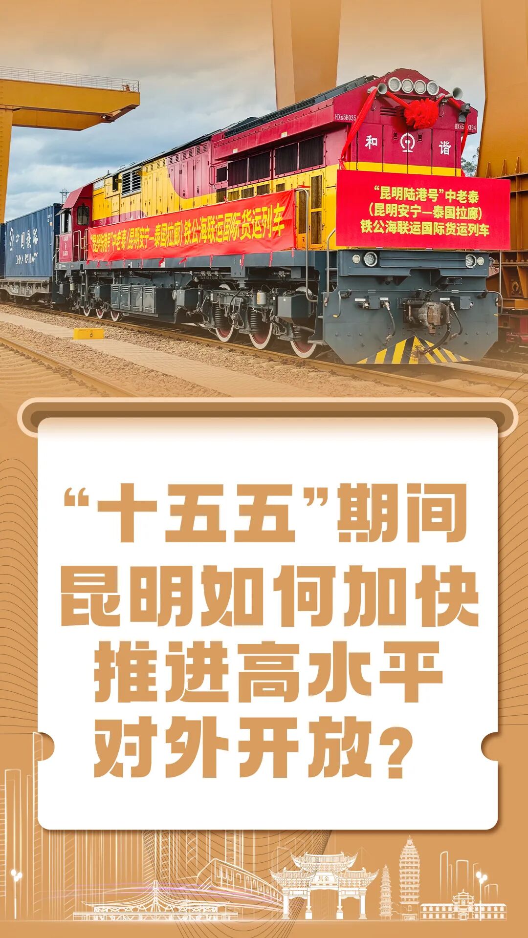 主动服务和融入高质量共建“一带一路”,加快建设以昆明为枢纽的交通物流、数字信息、能源大通道,推动区位优势加速转化为枢纽链接优势。深化中老铁路沿线综合开发,统筹推进国家物流枢纽、中欧(亚)班列集结中心、昆明国际陆港等枢纽建设,打造国际性综合交通枢纽城市。高标准建好昆明国际通信业务出入口局,打造面向南亚东南亚的国际通信枢纽、数字枢纽、数字产业高地。积极推进区域性国际能源大通道建设。